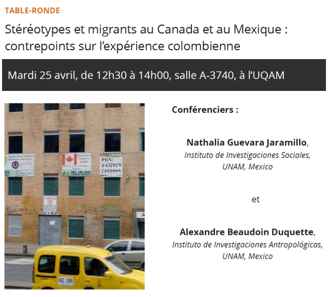 À partir de la notion de stéréotypes, les deux présentations explorent les expériences vécues par les migrant-e-s colombien-ne-s au Canada et au Mexique, autant de la perspective auto-ethnographique que du point de vue de l’histoire contemporaine de l’art. Les présentateurs feront ainsi ressortir les dissonances entre perception et réalité et leur rôle dans la construction et la reconstruction de l’image de soi.