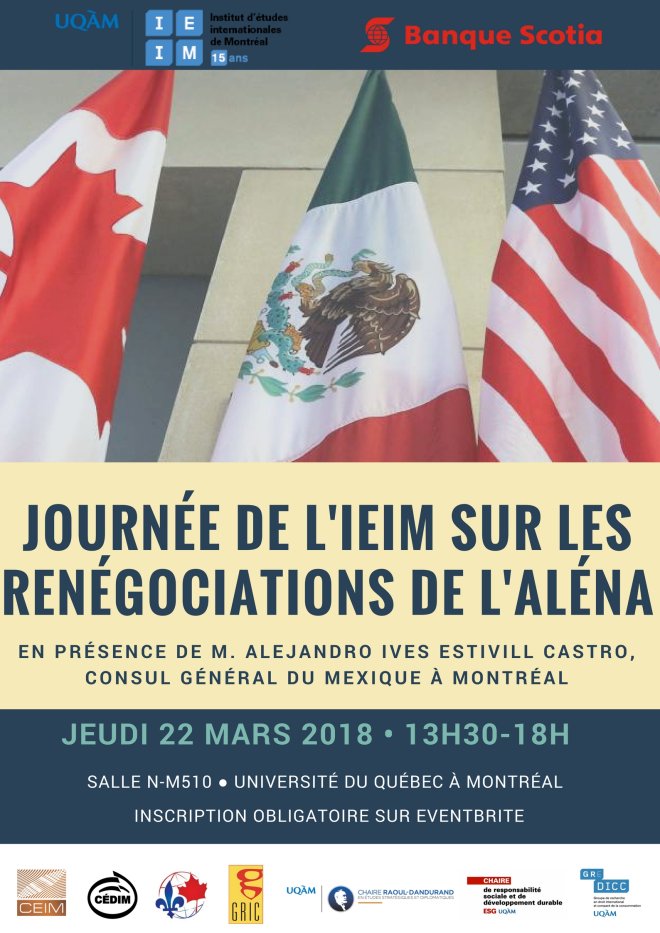 À l’occasion de la sixième séance de renégociations de l’ALÉNA, qui aura lieu au Mexique à la fin mars, l’Institut d’études internationales de Montréal (IEIM), en partenariat avec ses unités constituantes et en collaboration avec le Consulat général du Mexique à Montréal, organise une journée de recherche sur les enjeux environnementaux et la question des investissements dans les renégociations de l’ALÉNA.