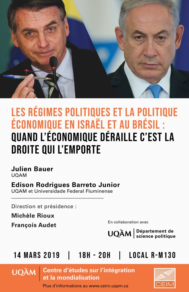 Le Centre d’études sur l’intégration et la mondialisation (CEIM) et le département de science politique de l’UQAM vous invitent à la conférence "Les régimes politiques et la politique économique en Israël et au Brésil : quand l’économique déraille c’est la droite qui l’emporte"