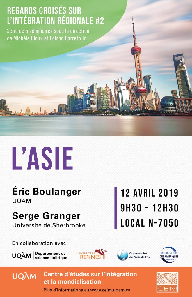 Le Centre d’études sur l’intégration et la mondialisation est heureux de vous inviter au deuxième séminaire de la série « Regards croisés sur l’intégration régionale » qui portera sur l’Asie.
