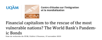 Créées pour fournir si nécessaire un financement aux pays les plus pauvres afin qu’ils puissent prévenir de futures épidémies, les obligations pandémiques ont été lancées par la Banque mondiale en 2017. Après un bref survol des obligations ca- tastrophes, cette note de recherche décrira la genèse des obligations pandémiques, leurs principales caractéristiques et le profil de ses investisseurs. Je soutiens que ces obligations ont été conçues avec une structure financière inhabituelle. En re- gardant le cercle restreint d’organisations privées derrière l’architecture, la pro- motion et l’arbitrage de ce « projet », l’opacité du processus décisionnel et la multi- tude de rôles joués par quelques acteurs laissent perplexe. Je ferai la démonstra- tion que ces obligations ont été constituées non pas afin d’aider à contenir des épidémies dans les pays les moins favorisés, mais plutôt afin d’assurer un profit à ses investisseurs.