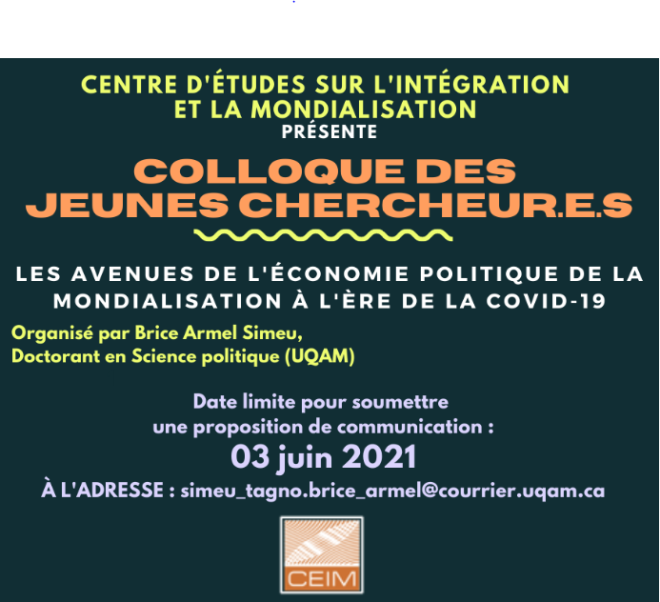 Brice Armel Simeu, doctorant en science politique à l’UQAM, organise le 11 juin 2021 de 09h30 à 12h un colloque des jeunes chercheur.e.s intitulé : « Les avenues de l’économie politique de la mondialisation à l’ère de la COVID-19 ».