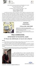 La sixième conférence du cycle de séminaires aura lieu ce mardi, 𝐥𝐞 𝟏𝟓 𝐟𝐞́𝐯𝐫𝐢𝐞𝐫, 𝐝𝐞 𝟏𝟒𝐡 𝐚̀ 𝟏𝟔𝐡. Le Professeur 𝐏𝐀𝐔𝐋 𝐃𝐔𝐌𝐎𝐔𝐂𝐇𝐄𝐋 (Département de philosophie, UQAM), nous présentera : "𝑨̀ 𝒍’𝒉𝒆𝒖𝒓𝒆 𝒅𝒖 𝒕𝒆́𝒍𝒆́𝒕𝒓𝒂𝒗𝒂𝒊𝒍, 𝒍𝒆 𝒍𝒆𝒖𝒓𝒓𝒆 𝒅𝒆 𝒍𝒂 𝒍𝒊𝒃𝒆𝒓𝒕𝒆́"