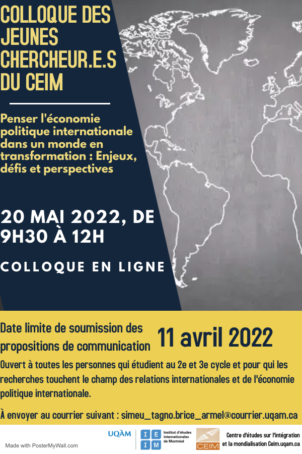 Participants : étudiants des 2e et 3e cycles supérieurs dont les recherches touchent le champ des relations internationales et de l’économie politique internationale