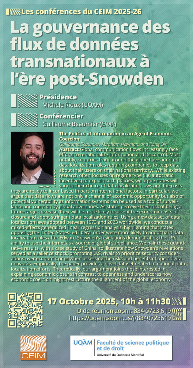 Abstract Global communication flows increasingly face efforts to renationalize information and its control. Most notably, countries from around the globe have adopted data localization rules requiring companies to keep data about their users on their national territory. While existing research often focuses on regime type (i.e. autocratic incentives) to explain such policies, we argue states will vary in their choice of data localization laws and the costs they are ready to incur based in part on international factors. In particular, we argue that data flows are not only a channel of economic opportunity but also of potential vulnerability as information systems can be used as a tool of surveillance and coercion by global adversaries. As states perceive their risk of being a future target increase, they will be more likely to accept the economic costs of closure and adopt stringent data localization rules. Using a new dataset of data localization laws adopted between 1973 and 2023 worldwide, we conduct a mixed-effects generalized linear regression analysis, highlighting that states opposing the United States-led liberal order were more likely to adopt hard data localization rules after Edward Snowden’s revelations demonstrating the US’s ability to use the Internet as a source of global surveillance. We pair these quantitative results, with a case study of China, to illustrate how Snowden’s revelations served as a salience shock, prompting U.S. rivals to prioritize security considerations over economic ones when assessing the risks and benefits of open digital networks. Empirically, the paper provides a novel dataset related to national data localization efforts. Theoretically, our argument joins those interested in explaining economic closure in contrast to openness and underscores how economic coercion might restructure the alignment of the global economy.